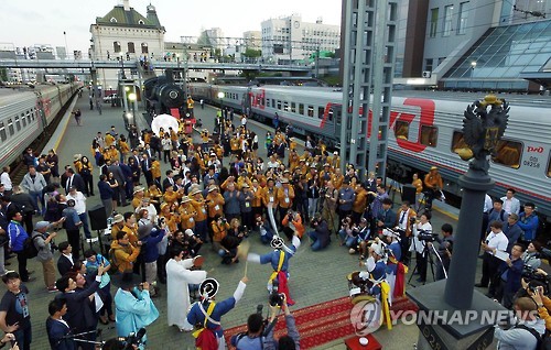 | △ 달려라, 유라시아 친선특급 (블라디보스토크<러시아>=연합뉴스) 15일(현지시간) 러시아 블라디보스토크역에서 유라시아 친선특급 열차 출정식이 열리고 있다. |