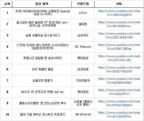 가족을 위해 헌신해온 어머니들에게 멋진 여성으로서의 삶을 다시 꿈꾸도록 응원한 삼성화재[000810]의 '아주 특별한 졸업'(6위), 250여명의 시민이 수만장에 달하는 색색의 포스트잇으로 하트 모의 그림을 만들어 가며 프러포즈를 선물하는 3M '절대 거절 못하는 포스트잇 프로포즈'(10위) 등도 인기를 끌었다.
