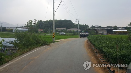 | △ 썰렁한 마을 (상주=연합뉴스) 손대성 기자 = 경찰이 음료수 독극물 사건이 발생한 경북 상주시 공성면 금계1리에서 탐문수사와 수색을 벌이고 있다. 2015.7.15 sds123@yna.co.kr |