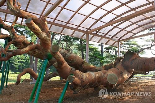 (괴산=연합뉴스) 변우열 기자 = 태풍으로 쓰러진 뒤 고사한 충북 괴산 '왕소나무' 주변 숲의 충북도 문화재 지정에 제동이 걸렸다.