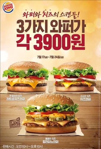 (서울=연합뉴스) 오예진 기자 = 햄버거 회사 버거킹은 이달 24일까지 고급 상품군인 할라피뇨와퍼, 콰트로치즈와퍼, 치즈와퍼 버거를 각각 3천900원에 판매한다고 17일 밝혔다.