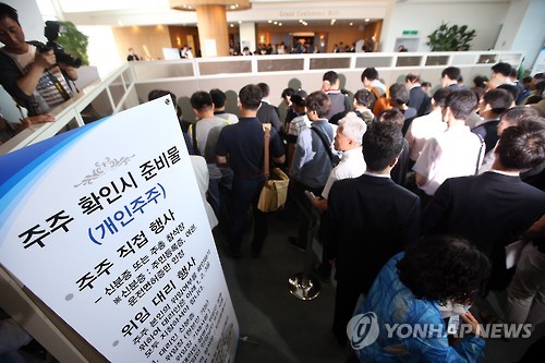 △ 삼성물산 임시 주주총회 (서울=연합뉴스) 박동주 기자 = 17일 오전 서울 양재동 aT센터에서 열린 삼성물산과 제일모직의 합병계약 안건을 주주 결의에 부치는 임시 주주총회에 앞서 주주들이 주주확인을 받고 있다. pdj6635@yna.co.kr