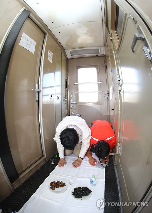 | △ 흔들리는 열차내에서 치러진 '자유시 참변' 위령제 (스바보드니<러시아>=연합뉴스) 김도훈 기자 = 17일(현지시간) 오전 자유시 참변의 현장인 러시아 스바보드시니시를 지나는 유라시아 친선특급 열차 내에서 헤이그 특사였던 이준 열사의 회증손자 조근송씨와 원정대원 윤승철 씨가 참변 당시 숨진 독립군 희생자들의 넋을 위로하는 제사를 지내고 있다. |