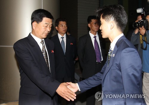 △ 남북공동위 6차 회의 성과 없이 끝나 (개성 사진공동취재단=연합뉴스) 이상민(오른쪽) 통일부 남북협력지구발전기획단장이 17일 새벽 제6차 개성공단 남북공동위원회 회담을 마친 뒤 개성공단 종합지원센터를 떠나며 박철수(북측) 중앙특구개발지도총국 부총국장이 악수하고 있다. 2015.7.17 photo@yna.co.kr
