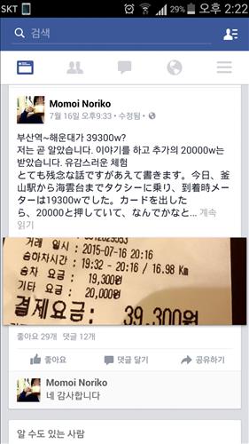 일본인 모모이 노리코(42·여) 씨는 16일 '부끄러운 이야기'라고 하면서 택시기사가 바가지요금을 요구한 경험을 자신의 페이스북에 올렸다.