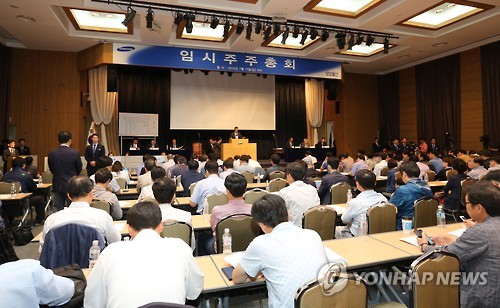 △ 삼성물산 주총…합병안 통과 (서울=연합뉴스) 17일 오전 서울 서초구 양재동 aT센터에서 제일모직과의 합병계약 안건을 주주 결의에 부치는 임시 주주총회가 열리고 있다. 삼성물산과 제일모직의 합병안은 이날 통과됐다. (삼성물산 제공)
