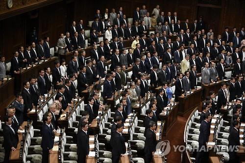 | △ 16일 중의원 본회의에서 자민당과 공명당 의원들이 집단 자위권 법안에 찬성 뜻을 표명하기 위해 기립한 모습.(EPA.연합뉴스) |
