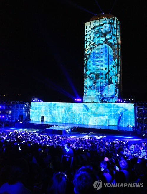 (속초=연합뉴스) 이종건 기자 = 디지털 영상제작 공연기획사인 미디어엔메세가 기획하고 박칼린 감독이 연출을 맡은 3D영상쇼 '더 블루(THE BLUE)'의 시연회와 제작발표회가 17일 오후 속초 영랑호리조트 잔디광장에서 개최됐다.
