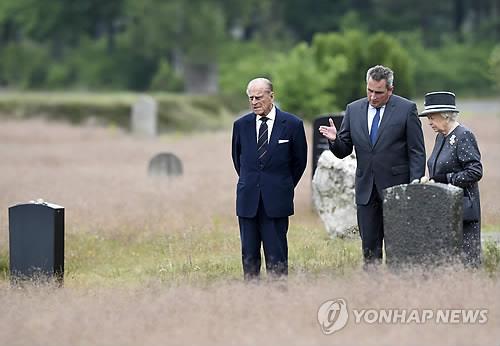 △ (베르겐-벨젠<독일> AP=연합뉴스) 독일을 국빈 방문 중인 영국 왕실의 엘리자베스 2세 여왕(오른쪽)과 부군 필립공(왼쪽)이 6월 26일(현지시간) 니더작센주 베르겐-벨젠 나치 강제수용소를 둘러보며 수용소 책임자의 설명을 듣고 있다. 베르겐-벨젠 수용소는 나치가 전쟁포로와 유대인들을 수용했던 곳으로 '안네 프랑크의 일기'로 유명한 유대인 소녀 프랑크가 숨지기 직전까지 지냈던 장소로 알려져 있다.
