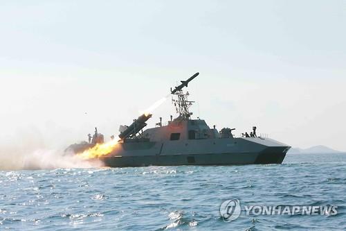 | △ 북한 함대함 미사일 발사 훈련 실시 (평양 조선중앙통신=연합뉴스) 조선중앙통신은 김정은 국방위원회 제1위원장이 참관한 가운데 해군 부대에 실전 배치 중인 함선 공격용 신형 함대함 미사일 발사 훈련을 실시했다고 15일 보도했다. 촬영일시는 따로 밝히지 않았다. 2015.6.15 |