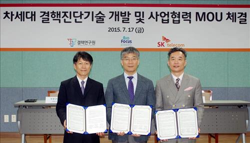 (서울=연합뉴스) 한지훈 기자 = SK텔레콤[017670]이 17일 차세대 결핵 진단기술을 개발하기 위해 나노엔텍[039860]의 자회사 바이오포커스, 대한결핵협회 결핵연구원 등과 양해각서를 교환했다고 19일 밝혔다.