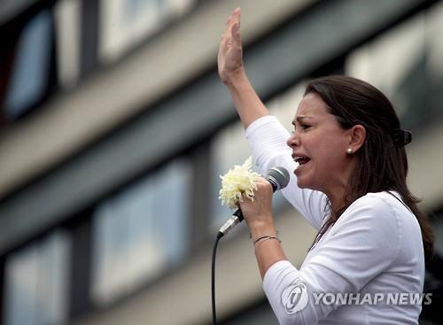 △ 지난 5월 베네수엘라 수도 카라카스에서 열린 반정부 시위에서 야당 의원 출신인 마리아 코리나 마차도가 연설을 하고 있다.(AP=연합뉴스DB)
