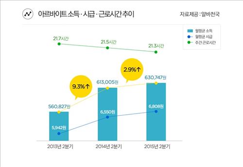 (서울=연합뉴스) 김연숙 기자 = 올해 2분기 전국 15세 이상 아르바이트 종사자의 월평균 소득 증가율과 평균 시급 증가율이 둔화하고 근로 시간도 줄어든 것으로 나타났다.