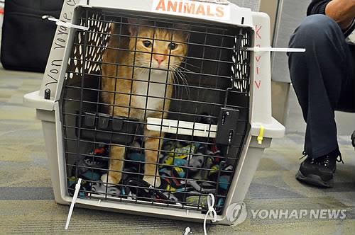 | △ (캘리포니아 AP=연합뉴스) 지난 3월18일 캘리포니아 팜스프링스 공항에서 오렌지색 고양이 한마리가 비행기를 타기 위해 대기하고 있다. |