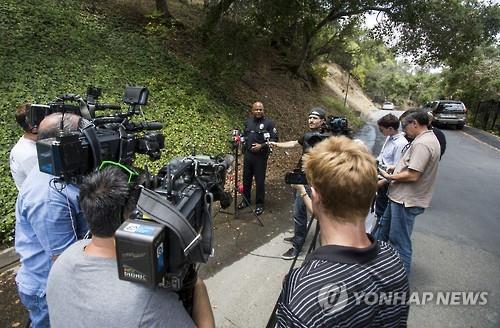 △ 비버리힐스에 있는 데미 무어 자택 입구에서 경찰 관계자가 사건을 설명하고 있다. (AP=연합뉴스)