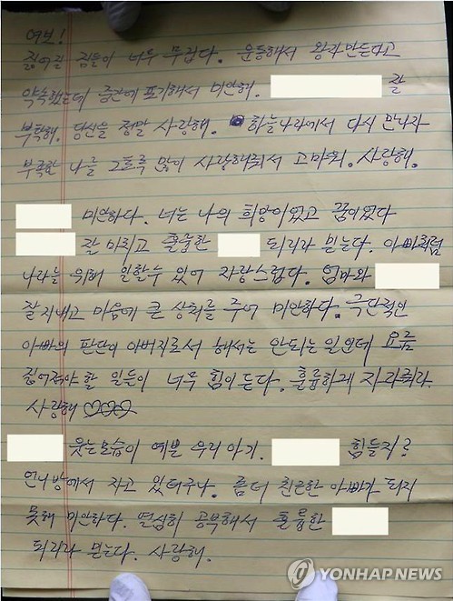 또 자녀들을 향해 "(큰딸에게)미안하다. 너는 나의 희망이었고 꿈이었다 ○○잘 마치고 훌륭한 ◇◇이 되리라 믿는다. 아빠처럼 나라를 위해 일할 수 있어 자랑스럽다"며 "극단적인 아빠의 판단이 아버지로서 해서는 안되는 일인데 요즘 짊어져야 할 일들이 너무 힘이 든다. 훌륭하게 자라줘라. 사랑해"라고 적었다.
