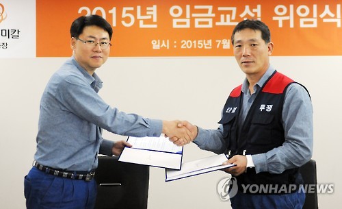 △ 한화케미칼 울산노조, 사측에 임금교섭 위임 (울산=연합뉴스) 한화케미칼은 울산공장 노동조합이 올해 임금교섭에 관한 모든 사항을 사측에 위임했다고 21일 밝혔다. 지난 20일 한화케미칼 울산공장에서 열린 '임금교섭 위임식'에서 류재규 공장장과 최규헌 노조위원장이 악수하고 있다. 2015.7.21 << 한화케미칼 제공 >> canto@yna.co.kr