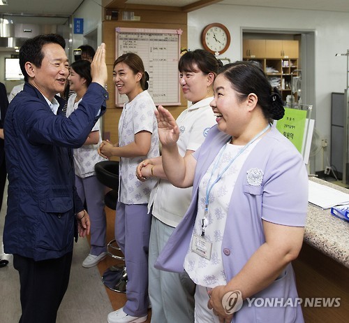 | △ "메르스 치료한 수원병원 의료진 여러분이 진짜 영웅" (수원=연합뉴스) 중동호흡기증후군(메르스) 중점치료센터로 지정됐다가 20일 재개원한 경기도의료원 수원병원에 21일 남경필 경기도지사가 찾아가 간호사들과 하이파이브를 나누며 의료진을 격려하고 있다. 2015.7.21 <<경기도 제공>> hedgehog@yna.co.kr |