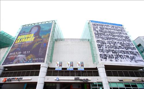 환하게 웃는 학생들의 얼굴을 담은 이 현수막은 성남아트센터가 개관 10주년을 맞아 마련한 '유럽현대미술전: 친애하는 당신에게-Bonjour, La France'에 참여한 프랑스 설치 사진작가 JR의 작품이다.