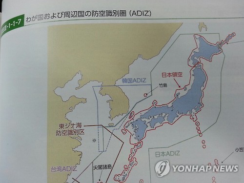 | △ 독도 일본땅으로 표시한 日방위백서의 지도 (도쿄=연합뉴스) 조준형 특파원 = 일본 방위백서에 11년 연속으로 독도가 일본땅으로 명기됐다. 사진은 독도가 일본 영토로 표기된 올해 일본 방위백서의 방공식별구역지도다. |