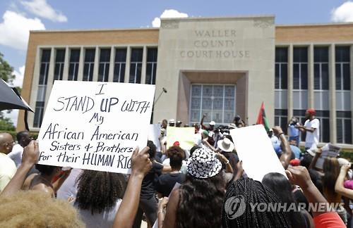 | △ 흑인 여성 샌드라 블랜드(28)가 교도소에 수감된 뒤 사흘 만에 의문사하자 인권 단체와 시위대가 지난 17일(현지시간) 미국 텍사스 주 월터 카운티 법원 앞에서 집회를 열고 진상 규명을 촉구하고 있다. (AP=연합뉴스 DB) |