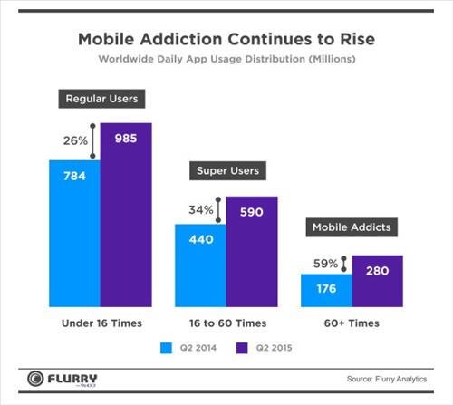 22일 야후가 인수한 모바일 앱 분석업체인 플러리(Flurry)의 보고서에 따르면 하루에 60번 이상 앱을 실행하는 사용자를 뜻하는 모바일 중독자는 지난해 2분기 기준 1억7천600만명에서 올해 2분기 기준 2억8천만명으로 59% 급증했다.