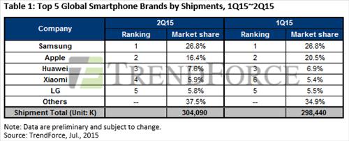 22일 D램익스체인지 트렌드포스 보고서에 따르면 2015년 2분기 스마트폰 출하량 기준 시장점유율은 삼성 26.8%, 애플 16.4%, 화웨이 7.6%, 샤오미 5.9%, LG[003550] 5.8% 순으로 파악됐다.