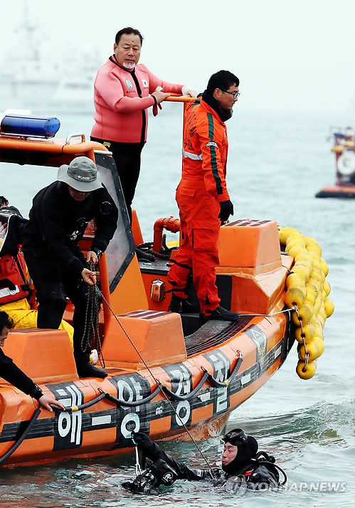 △ 지난해 세월호 침몰 현장에서 잠수수색에 참여한 UDT 출신이자 배우인 정동남(왼쪽 위)씨의 모습. (연합뉴스 자료사진)