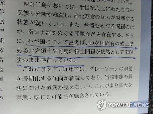 △ 2015년 일본 방위백서에 "우리나라(일본) 고유 영토인 북방영토(쿠릴 4개섬의 일본식 표현)나 다케시마(竹島·일본이 주장하는 독도의 명칭)의 영토문제가 여전히 미해결된 채로 존재하고 있다"는 표현이 담겼다.