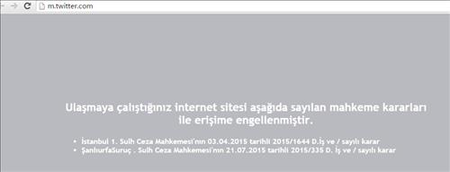이날 터키에서 트위터에 접속하면 "연결을 시도한 웹사이트는 아래 법원의 결정에 따라 차단됐다"며 테러가 발생한 샨르우르파주 수루치 법원의 결정이라는 공고문이 나온다.