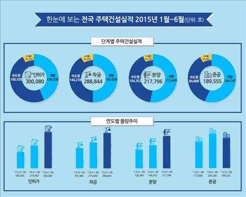 상반기 주택 인·허가 물량을 지역별로 보면 수도권이 16만550가구로 작년보다 74.7% 늘었다. 서울이 3만6천352가구로 2.8%, 경기가 11만4천685가구로 127.5%, 인천이 9천513가구로 55.3% 증가했다.