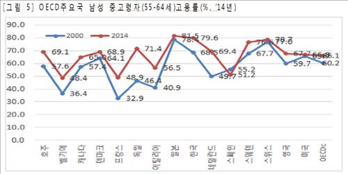 한국 남성은 55~64세 중고령자의 고용률에서도 OECD 회원국 중 2위를 차지했다.