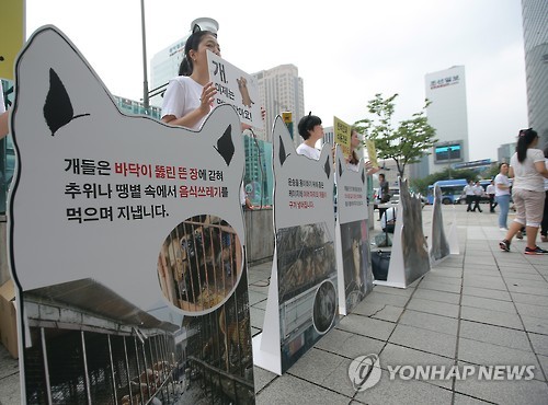 동물보호단체인 동물자유연대는 절기상 중복인 23일 서울 광화문역 인근에서 '한국 개들의 가혹한 일생' 캠페인을 펼쳤다.