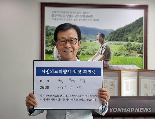 캠페인 취지에 동감하는 시민은 '원혜영 블로그'(http://www.whywon.net/1209)에서 사전의료의향서를 내려받아 작성한 뒤 인증 사진을 찍어 SNS(소셜네트워크서비스)에 올리거나 '원혜영의원실 이메일'(whywon21@daum.net)로 보내면 된다.