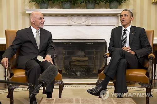 △ 지난 3월 24일 미국 워싱턴 백악관에서 버락 오바마 미국 대통령이 미국을 방문한 아슈라프 가니 아프간 대통령과 회담하고 있다.(AP=연합뉴스 자료사진)