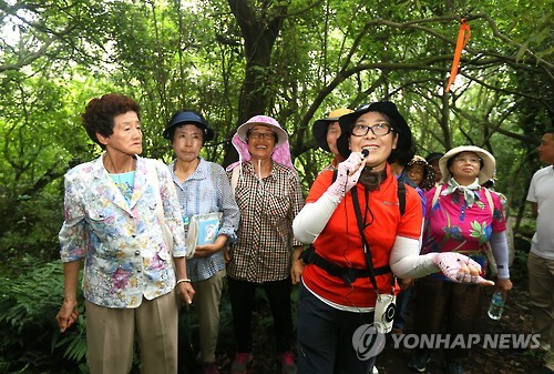 | △ (서귀포= 연합뉴스) 변지철 기자 = 24일 오전 제주 서귀포시 대정읍 신평리 일원에서 제주 곶자왈 도립공원 조성사업 준공식이 열린 가운데 도민과 관광객들이 곶자왈 탐방로를 걸으며 해설사로부터 곶자왈에 대한 설명을 듣고 있다. 2015.7.24 bjc@yna.co.kr |