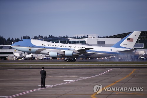△ Airforce One with President Barack Obama onboard arrives at the Portland International Airport, Thursday, May 7, 2015, in Portland, Ore. Obama arrived in Portland for a two-day visit to raise money for Democrats and to highlight trade. (Bruce Ely/The Oregonian via AP) MAGS OUT; TV OUT; NO LOCAL INTERNET; THE MERCURY OUT; WILLAMETTE WEEK OUT; PAMPLIN MEDIA GROUP OUT
