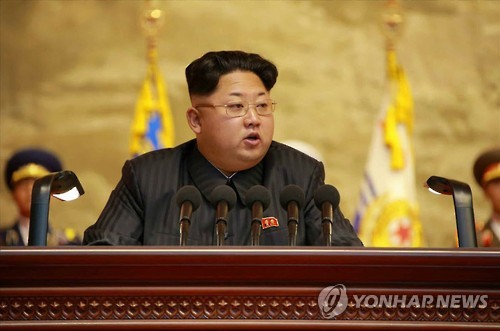 | △ 안경 쓴 김정은…전국노병대회 축하 연설 (서울=연합뉴스) 김정은 북한 국방위원회 제1위원장이 25일 평양에서 열린 전국노병대회에서 축하 연설을 했다고 조선중앙통신이 26일 전했다. 사진은 노동신문이 같은 날 보도한 김정은 제1위원장의 연설 장면. 2015.7.26 nkphoto@yna.co.kr |