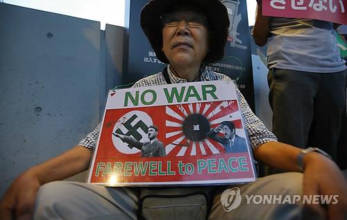 | △ 도쿄 '전쟁법안' 반대 집회 (도쿄 AP=연합뉴스) 23일(현지시간) 일본 도쿄의 국회의사당 앞 집단자위권 법안 반대 집회에서 한 참석자가 가슴에 나치 독일의 아돌프 히틀러(왼쪽)와 아베 신조 총리 사진이 나란히 담긴 포스터를 달고 있다. 나치와 일본 제국주의를 각각 상징하는 '하켄크로이츠' 휘장과 욱일기를 배경으로 '전쟁반대', '평화여 안녕' 이란 영문 문구도 들어 있다. bulls@yna.co.kr (끝) |
