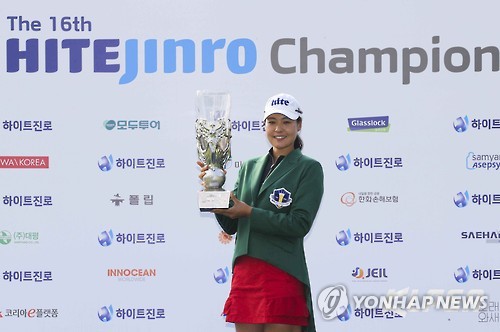 △ 우승 트로피에 들고 기념촬영하는 전인지 (서울=연합뉴스) 전인지(하이트진로)가 26일 경기도 여주시 블루헤런 골프클럽에서 열린 KLPGA투어 시즌 두번째 메이저대회인 제16회 하이트진로챔피언십 최종 라운드에서 우승한 후 트로피를 들고 기념촬영을 하고 있다. 전인지는 한해 한국, 미국, 일본 3개국 여자프로골프투어 메이저대회를 모두 우승하는 진기록을 세웠다. 2015.7.26 << KLPGA 제공 >> photo@yna.co.kr