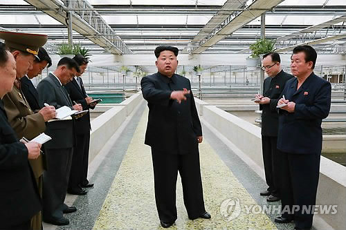 | △ 김정은 북한 국방위원회 제1위원장이 오는 10월10일 노동당 창건 70주년 경축행사를 앞두고 '깜짝 이벤트' 준비에 골몰하는 것으로 보인다. 사진은 지난 5월 대동강 자라공장 시찰 당시 김정은 북한 국방위원회 제1위원장의 모습. (연합뉴스 자료사진) |