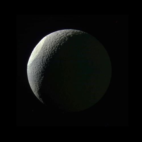 사진에서 왼쪽 위로부터 햇빛이 비치고 있으며, 오른쪽 아래는 토성에서 반사된 빛으로 희미하게 빛나고 있다.