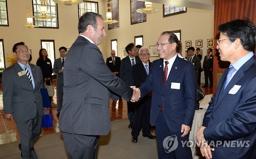 △ UC어바인대 방문한 황우여 부총리 (서울=연합뉴스) 황우여 사회부총리 겸 교육부 장관이 27일(현지시간) 미국 어바인 캘리포니아대(UC어바인)를 방문, 관계자들과 인사를 나누고 있다. (교육부 제공)