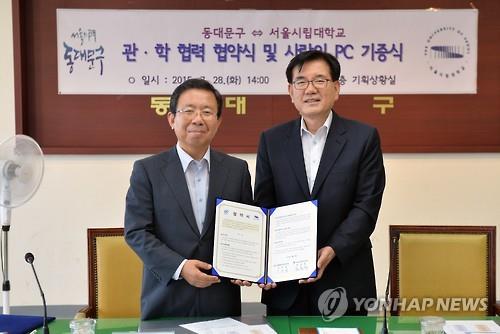 (서울=연합뉴스) 이효석 기자 = 서울시립대학교는 이날 오후 2시 서울 동대문구청에서 동대문구와 교육프로그램 활성화 및 지역사회 발전을 위한 관·학 협약을 체결했다고 28일 밝혔다.