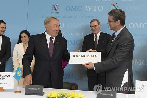누르술탄 나자르바예프 카자흐스탄 대통령과 호베르토 아제베도 WTO 사무총장은 27일(현지시간) 스위스 제네바의 WTO 본부에서 카자흐스탄의 가입의정서에 최종 서명하며 기나긴 여정에 종지부를 찍었다.