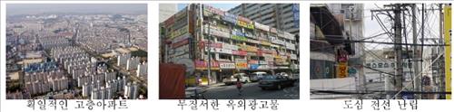 도시에서는 성냥갑 같은 고층아파트와 무질서한 옥외 광고물이, 농어촌지역에서는 주변과 조화를 이루지 못하는 건축물과 부적절한 색채 사용, 임시 시설물 방치 등의 문제가 지적됐다.