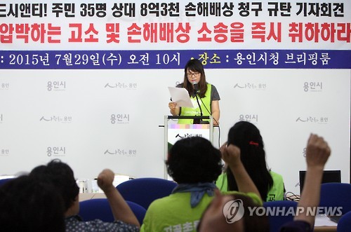 △ "학교앞 연구소 안돼" 학부모 반발에 업체 소송 '맞불' (용인=연합뉴스) 최종호 기자 = 29일 경기 용인시청에서 지곡초등학교 학부모와 인근 주민 등 30여명이 콘크리트 혼화제 생산업체인 ㈜실크로드시앤티가 학부모·주민 등 35명을 상대로 공사 지연 책임을 물어 8억3천만원을 배상하라는 소송을 제기한 데 대해 비판하는 기자회견을 열고 있다. 업체 측은 지난해 지곡초 앞 부아산 중턱에 콘크리트 연구소 건립을 추진 중이지만 유해물질 배출, 산림 파괴, 학생 안전사고 우려 등을 이유로 내세운 학부모와 주민 반발에 부딪혀 공사를 진행하지 못하자 최근 손해배상 소송을 청구했다. 2015.7.29 zorba@yna.co.kr