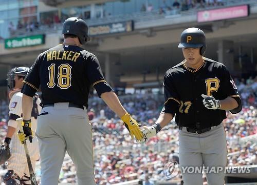 △ 강정호(28.피츠버그 파이리츠)가 29일(현지시간) 미네소타 트윈스와의 방문경기에서 2회 선제 솔로 홈런을 친 뒤 후속 타자 닐 워커의 축하를 받고 있다. (AFP=연합뉴스)