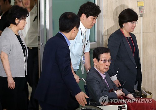 | △ 신격호 롯데그룹 총괄회장의 장녀인 롯데복지재단 신영자 이사장(맨 왼쪽)이 28일 오후 휠체어에 탄 신 총괄회장과 함께 김포국제공항을 통해 귀국하고 있다. |