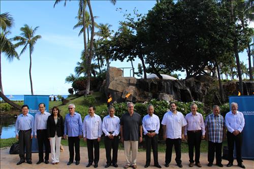 | △ 사진 왼쪽에서 7번째가 TPP 협상을 주도하는 마이클 프로먼 미국무역대표부(USTR) 대표. 왼쪽에서 8번째이자 그 오른쪽 옆은 일본의 아마리 아키라 TPP 담당상. |